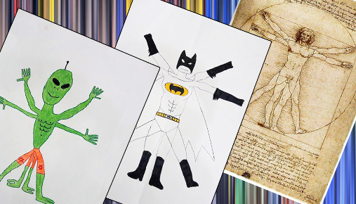 Confira a criatividade dos alunos do 9º A, ao criarem a releitura do "Homem Vitruviano" de Leonardo da Vinci, com o auxílio da profa Sandra.